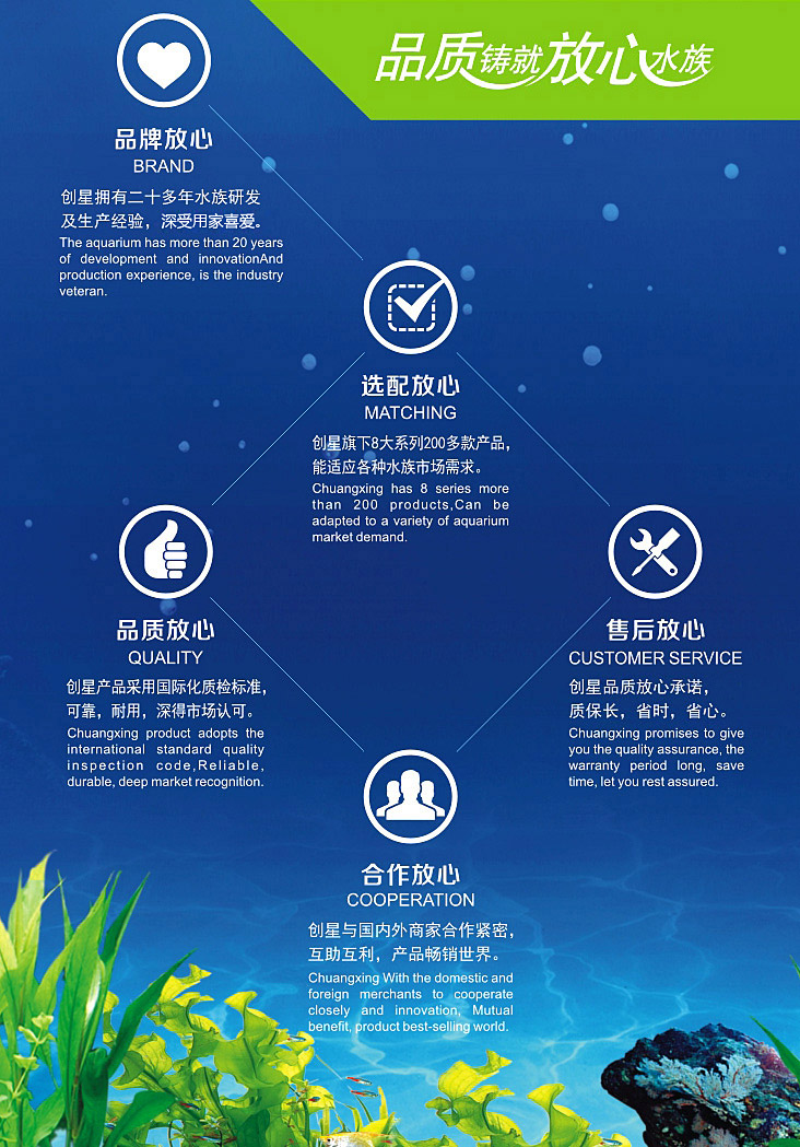 爲讓市場更瞭解創星核心價值觀,我們重塑瞭新的廣告語:“品質鑄就放心水族”。